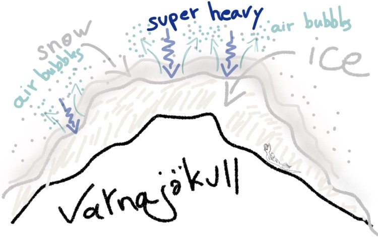 Parfois, lorsqu’il neige, des bulles d’air sont comprimées et extraites de la neige, qui s’intègre au glacier. La glace ainsi créée est alors plus lourde, ou plus dense .