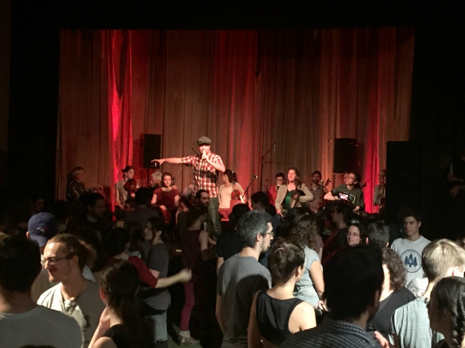 Alors, un groupe avec pas mal de violons, une grosse caisse irlandaise, des danseurs de claquettes qui dansent, un guitariste, une chorale de jeunes femmes déguisées en vieilles sorcières, des accordéons… un festival plein de couleurs, de musique et de blagues. À mes yeux, qui ne sont pas du tout québécois, ça ressemble moins à une soirée qu’à un joyeux miracle. Ici, les gens peuvent vraiment sortir, s’amuser, danser, se tenir la main, courir ensemble – et c’est là l’essentiel – sans avoir à être complètement saouls pour supporter l’horrible musique pop des hit-parades. Sur cette piste de danse, seules les mélodies en mouvement, directement issues des mouvements des musiciens, vous parviennent aux oreilles.