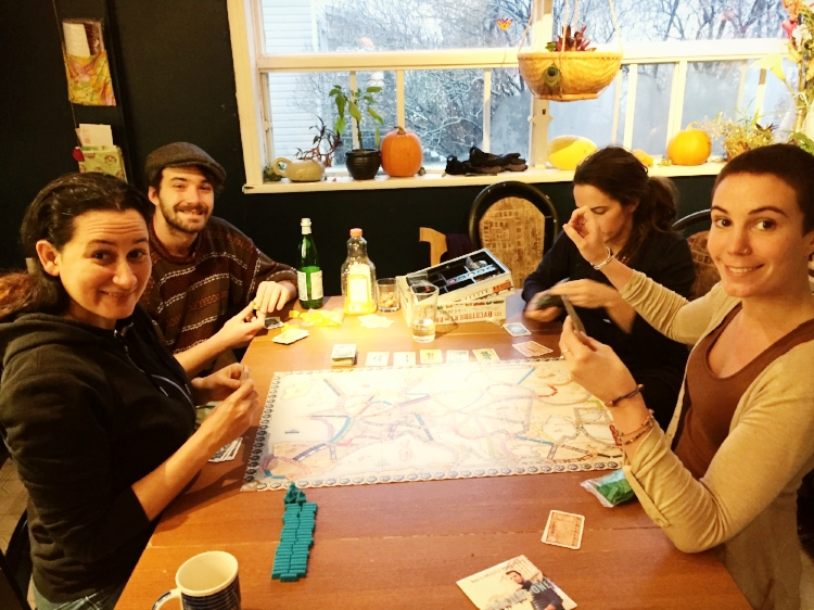 Marie (à droite) et Aubert (à gauche avec le chapeau) partagent leur lot d’anecdotes intéressantes sur ces road trips au ukulélé dans le podcast ! Ici, photographiés avec quelques colocataires et occupés à leur propre road trip (avec des jeux de société).