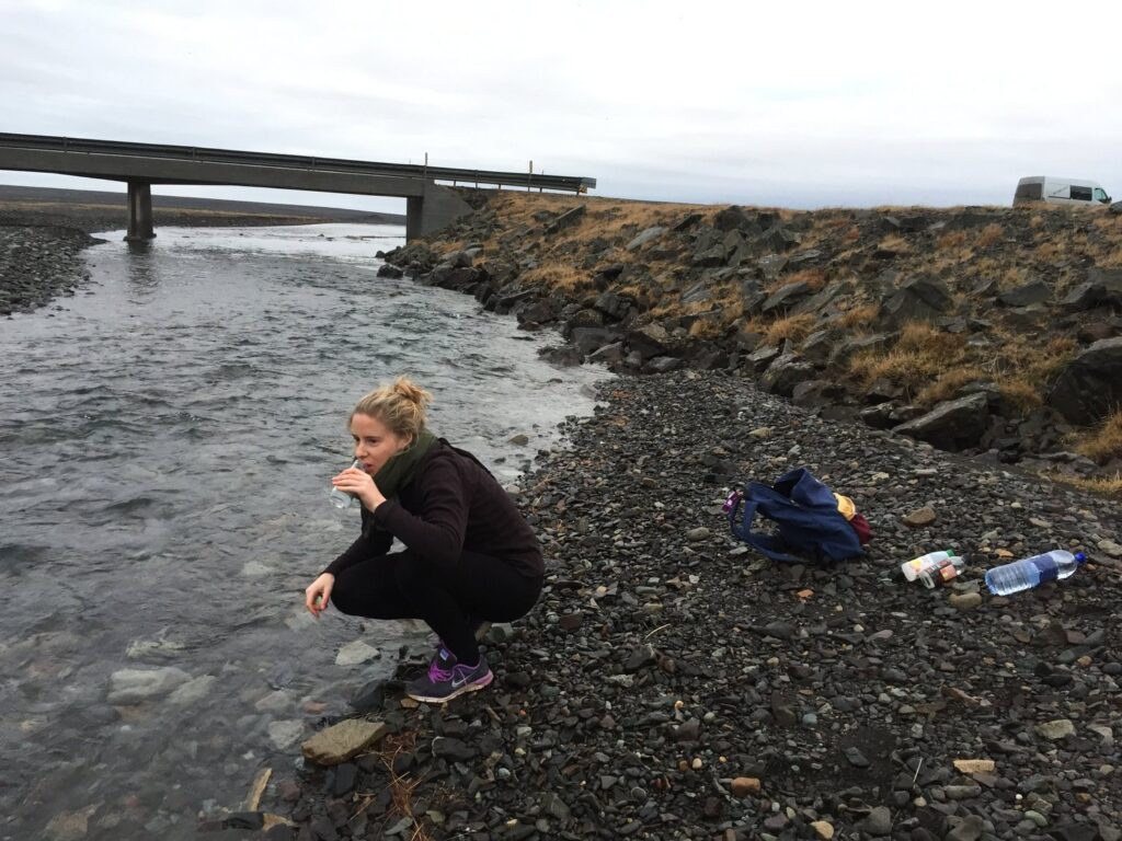 Sur la photo : à gauche : un pont et un peu d’eau douce, au milieu : copilote et caméraman occasionnelle de l’aventure islandaise, en haut à droite : le fidèle destrier et studio-cuisine, le Renault Master Kuku Camper Van