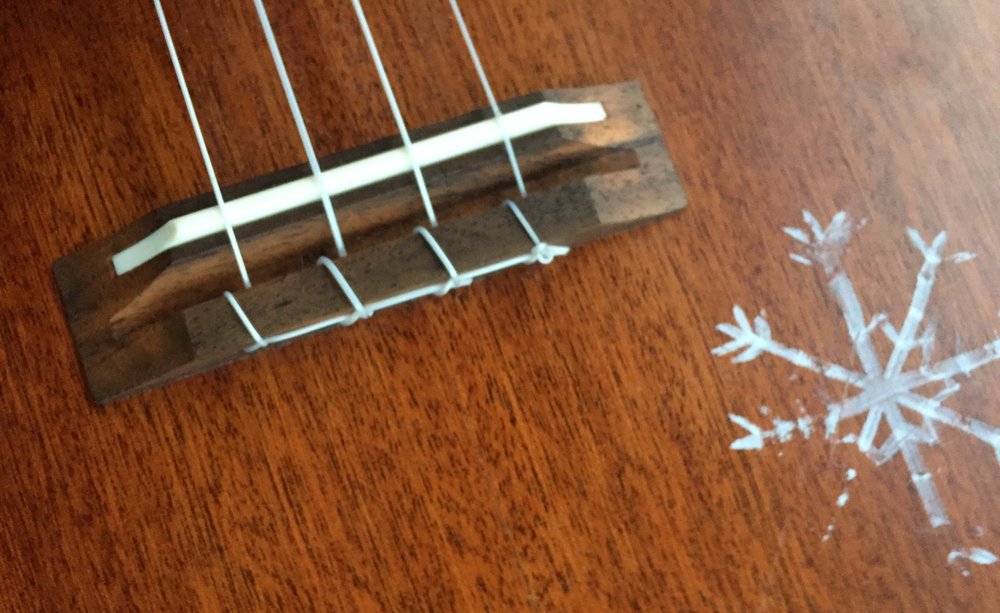 Gros plan d’un flocon de neige sur mon ukulélé ténor dessiné par un étudiant en art à Reykjavik.